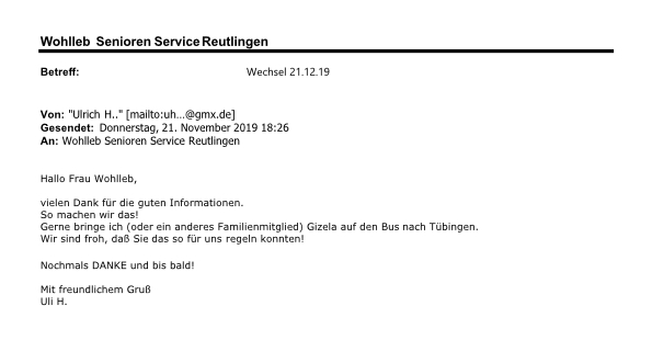 27.Januar 2023 an Wohlleb Senioren Service:Betreff: Vielen Dank für allesLiebe Frau Wohlleb,nun habe ich endlich mal Zeit Ihnen ein paar Zeilen zu schreiben. Vielen herzlichen Dank für die Organisation der Betreuung meines Vaters in den letzten dann fast dreieinhalb Jahren!Sie waren stets mit Rat und Tat an unserer Seite und haben uns teilweise tolle Betreuungskräfte vermitteln können. Und auch wenn es mit der einen oder anderen Betreuungskraft dann doch mal nicht so ganz rund lief, waren Sie stets erreichbar, hörten sich unsere Anliegen geduldig an und konnten professionell für Lösungen sorgen.Auch in der schweren letzten Zeit meines Vaters, konnte man sich voll und ganz auf Sie und Ihre Unterstützung verlassen. Vielen Dank für alles und alles Gute Ihnen.Die besten Grüße von Familie T. F. aus Eningen