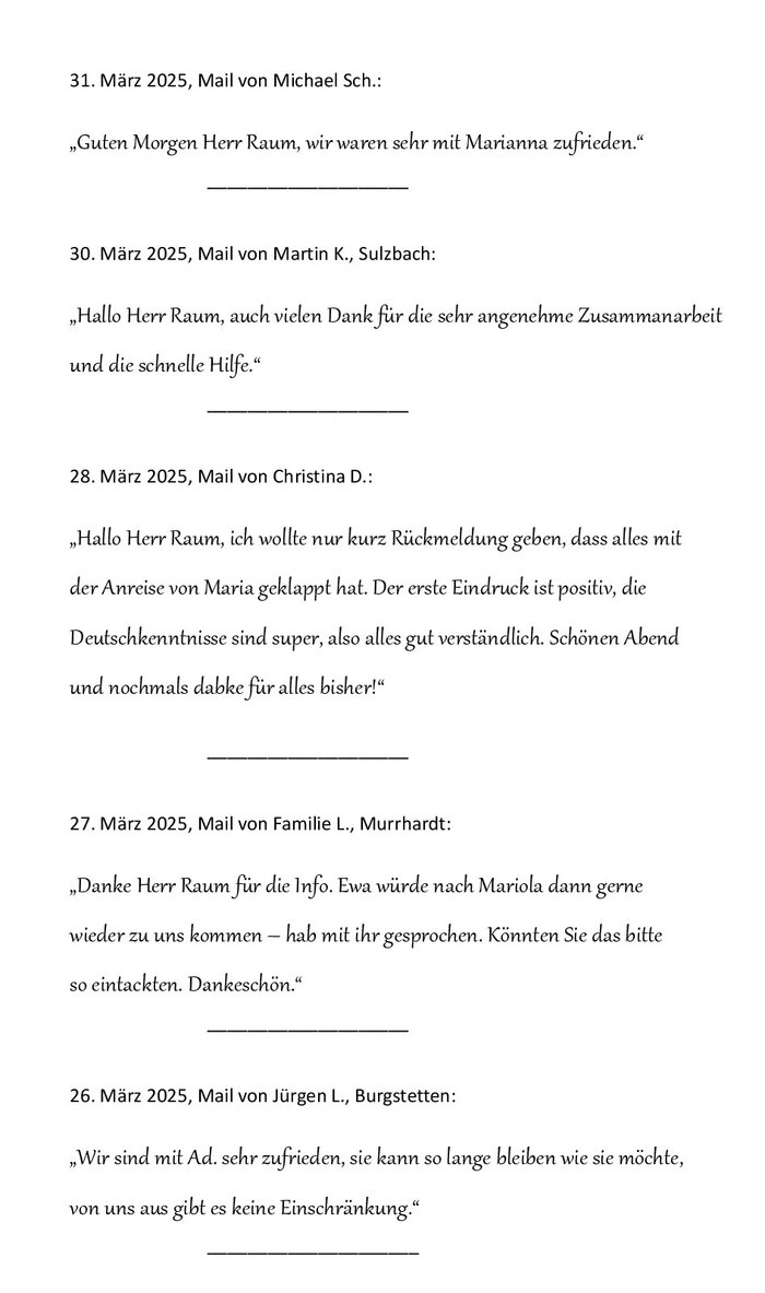 April `24, Wohlleb Senioren ServiceGuten Morgen Frau Wohlleb,zunächst möchte ich mich für ihre tröstende Worte bedanken. Und auch, dass sie gleich mit der slowakischen Agentur sich in Verbindung gesetzt haben.Dass unsere Mutter so schnell wegstirbt, mit dem hat niemand gerechnet. Für sie, war es eine Erlösung.Liebe Frau Wohlleb wir danken Ihnen für ihre Bemühungen.Werden ihre Agentur wärmstens weiterempfehlen.Mit freundlichem GrußKarin S.
