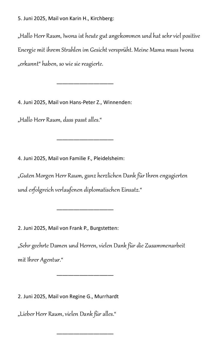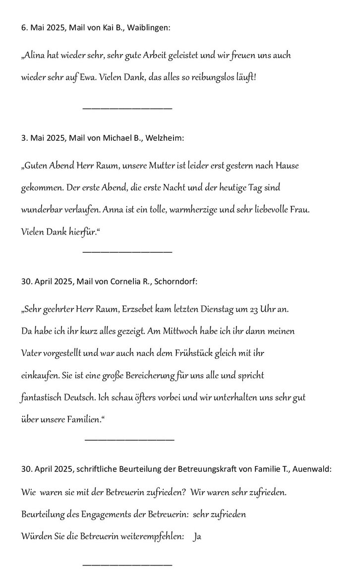 Juni `25, Wohlleb Senioren ServiceSehr geehrte Frau Wohlleb,Re Feedback:Die Agentur und Ihre Vertretung wurden uns von Freunden meiner Mutter empfohlen, die diese Pflege schon viele Jahre in Anspruch nimmt. Die Empfehlung geben wir uneingeschränkt weiter.In einem so schwierigen Umfeld, in so traurigen Umständen für alle Familienbeteiligten, ist es ein Segen, dass es einen solchen Service überhaupt gibt. Uns ist sehr bewusst, dass die Arbeit für die Betreuerinnen oft emotional und auch körperlich sehr belastend ist. Dazu die fremde Umgebung und Sprache, die schnelle Einsatzbereitschaft und die Umplanungen wie in unserem Fall, das ist schon schwierig.Es war für uns als Familie eine Riesenhilfe, dass Sie persönlich so ruhig, umsichtig und erfolgreich organisiert, vermittelt und "therapiert" haben :-)) Es war eine Freude, mit Ihnen zu arbeiten.Wir wünschen Ihnen weiter viel Erfolg und alles Gute für die Zukunft.Elke P.____________________________________________________________________________Mai `25, Wohlleb Senioren ServiceSehr geehrte Frau Wohlleb,wir werden durch Sie und Ihre Agentur seit knapp 2 Jahren betreut.Wir bedanken uns bei Ihnen für die zuverlässige Erreichbarkeit, die schnelle und unkomplizierte Auswahl und Bereitstellung der 24 Stunden Pflegekräfte. Wir fühlen uns bei Ihnen gut aufgehoben.Mit freundlichen GrüßenDagmar K., Betzingen